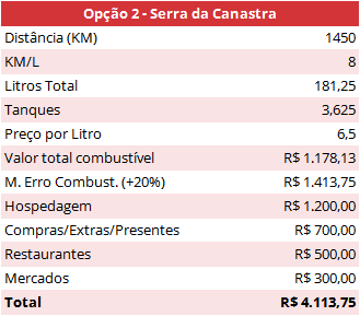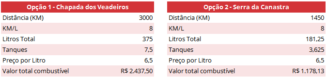 Exemplos de cálculo de valor estimado total para a viagem de carro para a Serra da Canastra