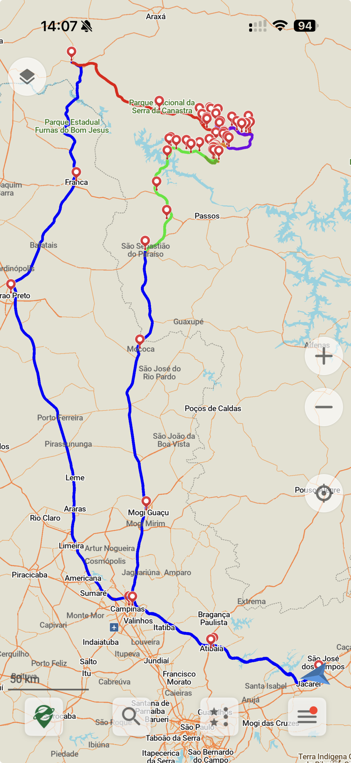 Captura de Tela do Planejamento de Rota na viagem para a Serra da Canastra, no aplicativo Organic Maps.