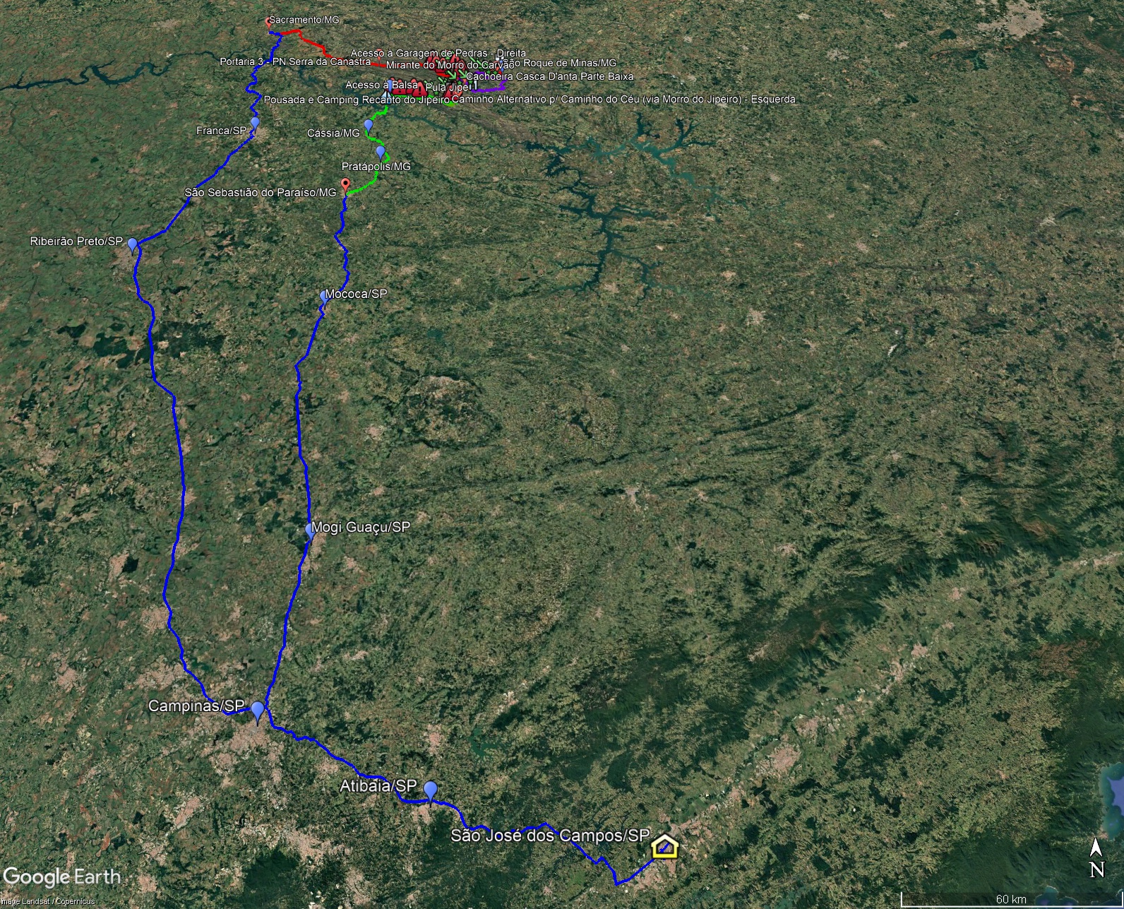 Planejamento da rota e pontos a serem visitados durante à viagem para a Serra da Canastra (Google Earth)