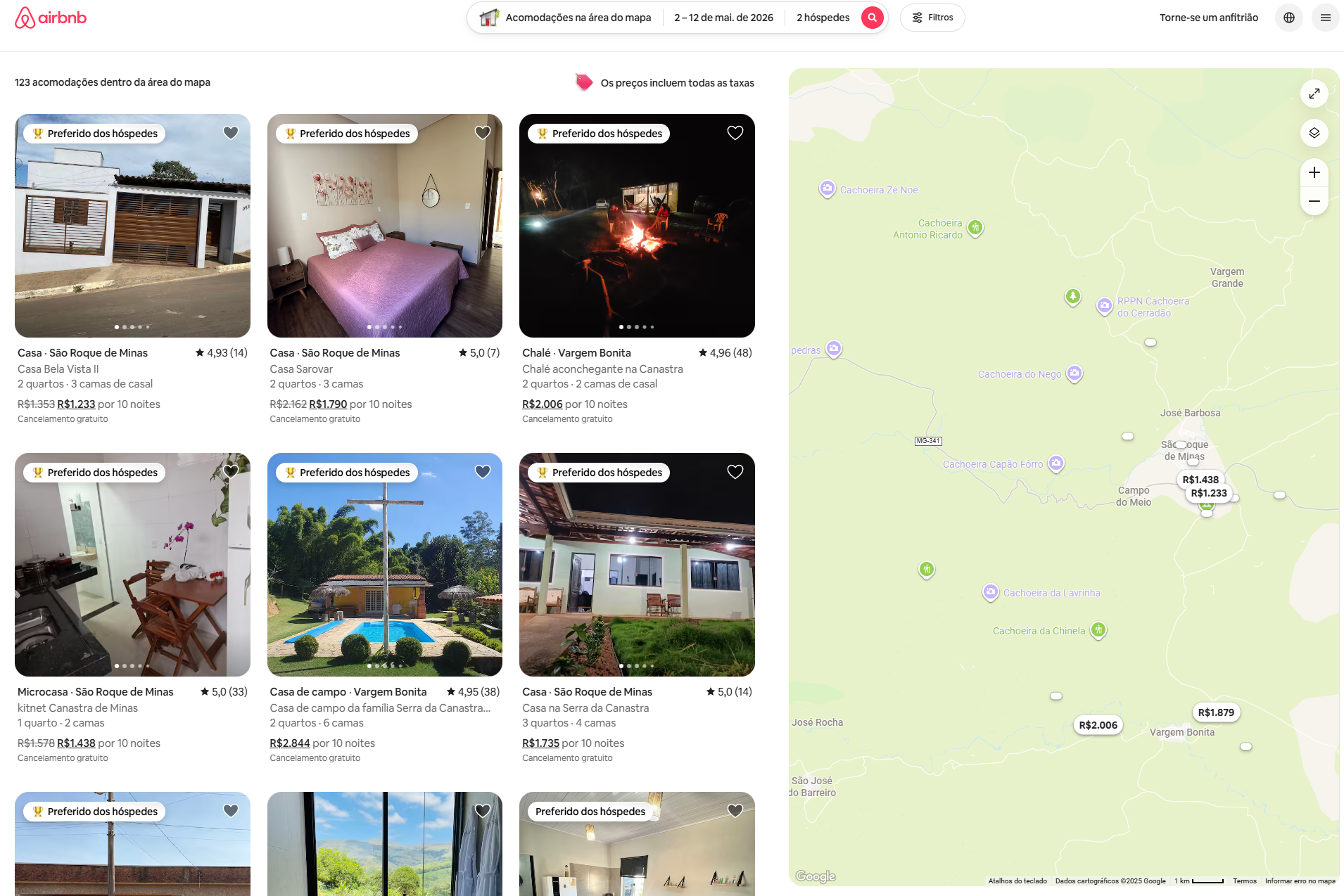 Hospedagens na Região da Serra da Canastra, via Airbnb (valores referentes à dez/2025)
