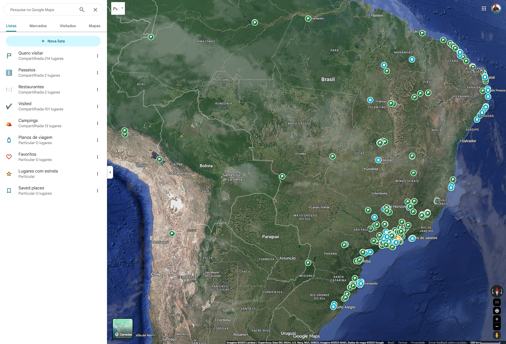Captura de Tela do Google Maps, com marcadores de locais visitados e locais com "Quero Ir".