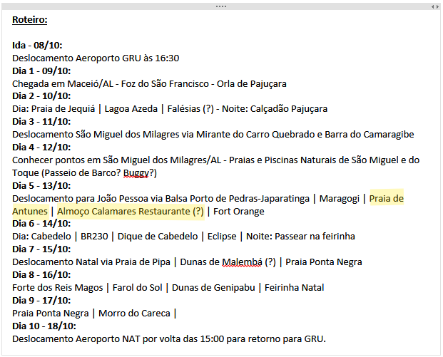 Captura de Tela do OneNote, que contém uma tabela do Roteiro planejado para a Viagem pelo Litoral Nordestino.